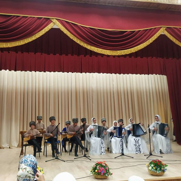 Наш юный талант,ученик 7 класса, Тааев Ислам выступает на сцене, в составе ансамбля "Оркестр"на открытии дома культуры с.Закан-Юрт.