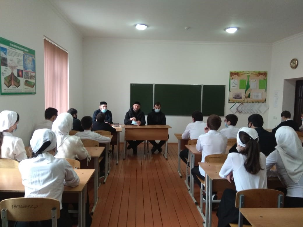 09.12.202009.12.2020г. проведена беседа на тему: «Профилактика безнадзорности и правонарушений несовершеннолетними». В беседе принимали участие глава села Шаами-Юрт Жанаралиев Юша1, и зам главы администрации села Шаами-Юрт Магамадов Селим. В ходе беседы глава администрации Жанаралиев Ю.К. объяснил учащимся что чеченские адаты не позволяют нам безнадзорности и правонарушений и мы в ответе за каждого нашего односельчанина.