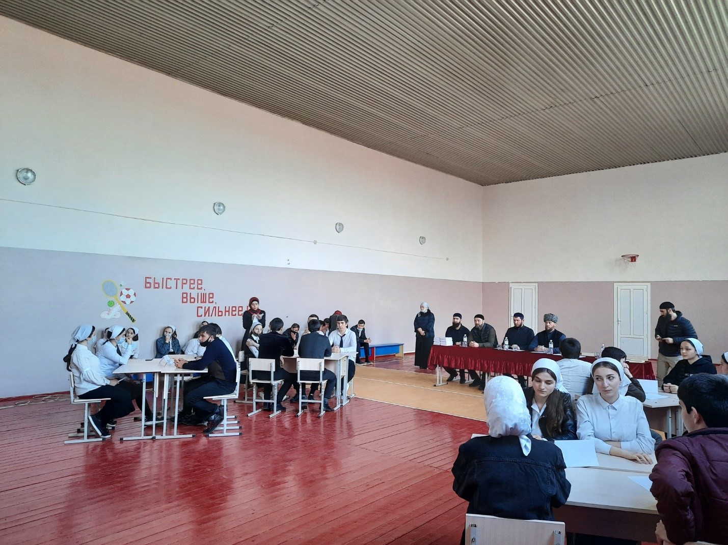 04.02.202104.02.2021г. в МБОУ «СОШ №2 с Шаами-Юрт» состоялся конкурс приуроченный к месяцам Ражаб, Ша1бан, Рамадан. На мероприятие были приглашены кади Ачхой-Мартановского района Дацуев Абдул-Рашид и глава Шаами-Юртовского сельского поселения Джанаралиев Юша, наиб имама села Сибиров Рамзан и учитель медресе Бекбулатов Хусайн. Цель мероприятия: повысить духовно-нравственное воспитание учащихся и привить любовь к своей религии.