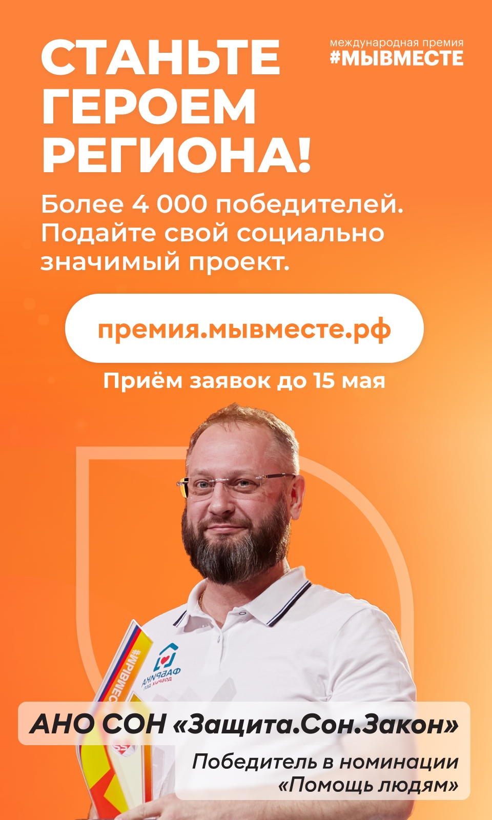 30.03.2023тарт Международной Премии #МЫВМЕСТЕ: получите поддержку своего проекта! Заявите о своем социально значимом проекте в одной из 11 номинаций. Ваше доброе дело может быть связано с помощью животным, незащищенным слоям населения, экологией, туризмом, раскрытием талантов, добровольчеством, наукой и многим другим. Читайте подробнее о номинациях и подавайте заявку на Премию до 15 мая на премия.мывместе.рф. Участвуйте как волонтер, НКО или бизнес-компания. Победителей ждет: → общественное признание → грант до 3 000 000 ₽ → специальная благодарность от руководства страны → статус «Партнер национальных проектов» → путешествие по России и дополнительные баллы в конкурсах от АНО «Россия — страна возможностей» → включение и интеграция в сообщество #МЫВМЕСТЕ → прохождение образовательной программы → бесплатное участие в ПМЭФ → продвижение в СМИ, публикация в сборнике для тиражирования, медиасопровождение от АНО «Национальные приоритеты» Кроме того, победители смогут выбрать наставника из числа членов Оргкомитета, известных государственных и общественных деятелей, первых лиц страны. Участвуйте в Премии и познакомьте всю страну с вашим проектом!